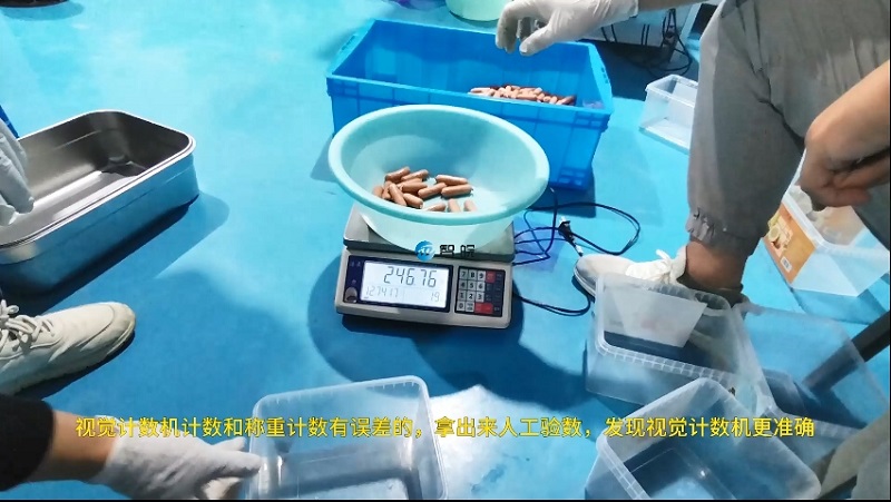 在視覺(jué)計(jì)數(shù)機(jī)上設(shè)置20個(gè)/包,視覺(jué)計(jì)數(shù)機(jī)進(jìn)行計(jì)數(shù),人工接下每一包,放置計(jì)數(shù)稱上進(jìn)行復(fù)核,將計(jì)數(shù)稱顯示非20個(gè)的4包進(jìn)行人工驗(yàn)數(shù),發(fā)現(xiàn)實(shí)際都是20個(gè),說(shuō)明計(jì)數(shù)機(jī)計(jì)數(shù)準(zhǔn)確。